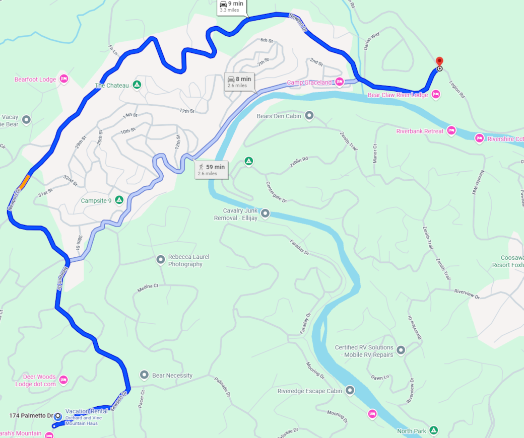 You will get gate access information directly from the Coosawattee River Resort (CRR). Enter CRR from Legion Road, once through the gate you will be on Newport Drive. Follow Newport Drive 3.3 miles (9 Min), turn right onto Palmetto Drive and in about 1,000 ft Orchard & Vine Mountain Haus will be on the right. Enjoy your stay, drive slow through the resort and watch for deer!
